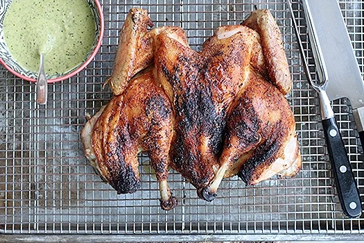 GRILLED BUTTERFLIED CHICKEN WITH CHARRED JALAPENO SAUCE