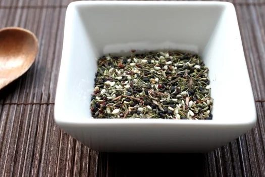 Combine with the dried mint, chili powder, black pepper and salt.  Store in an airtight container, preferably in a cool spot – it will keep for about a month.