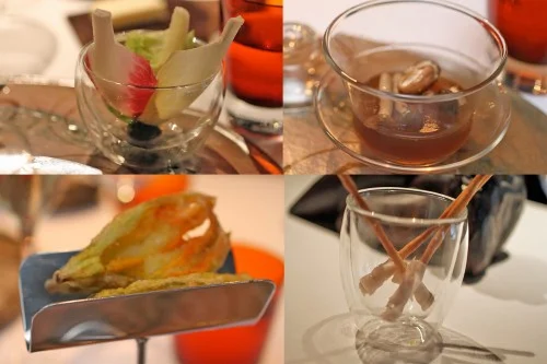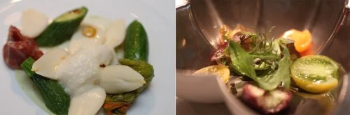I don’t know where to begin with the food!  We did the summer tasting menu instead of à la carte, and it was a serious affair.  An amuse bouche to introduce the three amuse bouches courses – each course having three different amuses.  Is that confusing enough??? It was for me too, in fact.  Crunchy squash blossoms, chicken gelée with mushrooms, parmesan grisini with lardo di colonnata, endive spears with aioli and olivade to name a few…Nine tiny dishes later, the actual menu began.