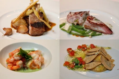 Zucchini with eggplant, green almonds, and jamón served alongside a crunchy tartlet with anchovy sauce was the first full dish of the menu.  This one was kind of a blur for me to be honest.  Then came delicious langoustines in a creamy parsley sauce with a cherry tomato salad.  Next, my favorite dish!!  Little dumplings filled with a creamy cheese, basil, pine nuts, and spring onions covered (generously) with summer truffles…I’m still dreaming about this one.  A stuffed, huge calamari came after with a delicious, rich butter sauce and really thin crispy, green peppers.  Finally, there was an amazing goat for two, which came in at a close second to the truffle dumplings – it’s quite frankly hard to beat that.  The goat was a succulent rib, perfectly charred and not too gamey, in a delicious jus with baby corn, pearl onions, and nutty roasted garlic.