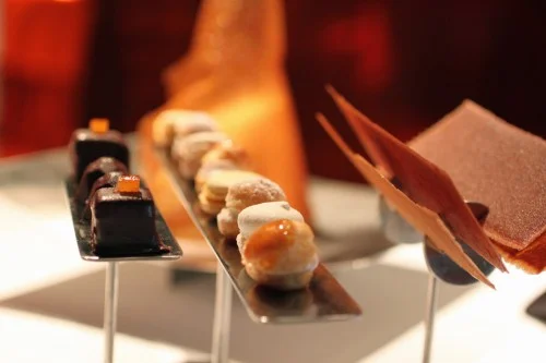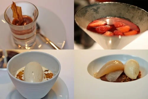 The desserts included a delicious melon soup, baked pears with pear ice cream over crunchy caramel, a strawberry and hibiscus non-alc martini, rich vanilla ice cream over apple macedoine, and an amazing petit fours course.