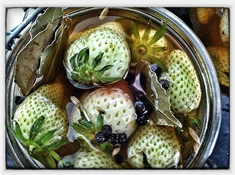 This year, I also wanted to experiment pickling green strawberries. It’s a different kind of pickling liquid then you might think - less vinegar, a little more sugar and a lot of flavor! The green strawberries turn a bit sweet, slightly tart and still retain a nice bite. These pickled strawberry makes them a perfect addition to any summer salad or cheese plate. Enjoy!