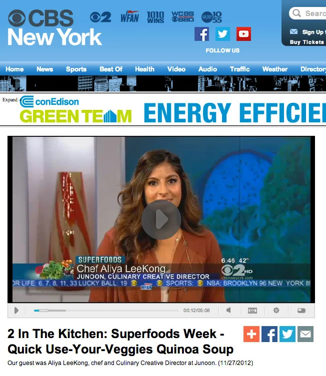 CBS New York featured Aliya in a cooking segment about the superfood quinoa where she made a Peruvian Quinoa Soup.